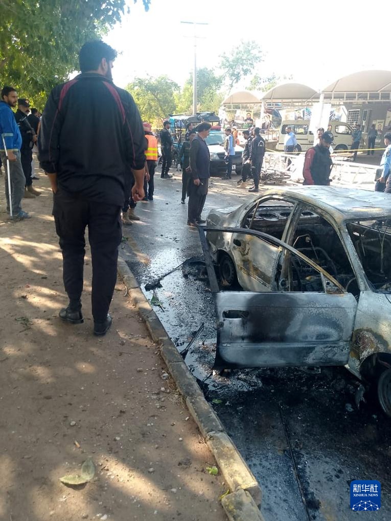 11月11日,安全救援人员在巴基斯坦首都伊斯兰堡检查爆炸现场(手机照片)。巴基斯坦当局11日宣布,首都伊斯兰堡当天发生自杀式炸弹袭击,造成至少12人死亡、27人受伤。中国驻巴基斯坦大使馆向记者证实,目前尚无中国公民在袭击中受伤的报道。新华社